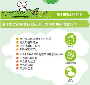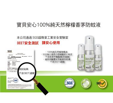 寶貝安心純天然檸檬香茅防蚊液強調使用100%純天然植物精油 不含防腐劑也不含DEET 而且有通過SGS瑞士檢驗安心核定