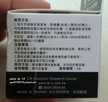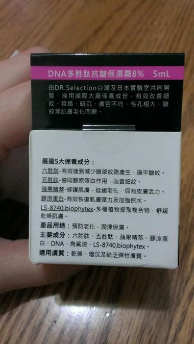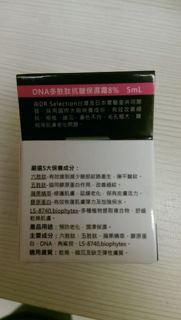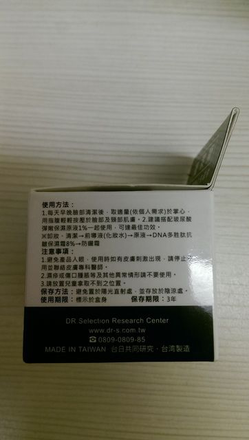 Dr. Selection DNA多胜肽抗皺保濕霜8%的外包裝非常地詳細。 標明成份、用途、適用膚質、使用方式、注意事項、有效期限……等等。