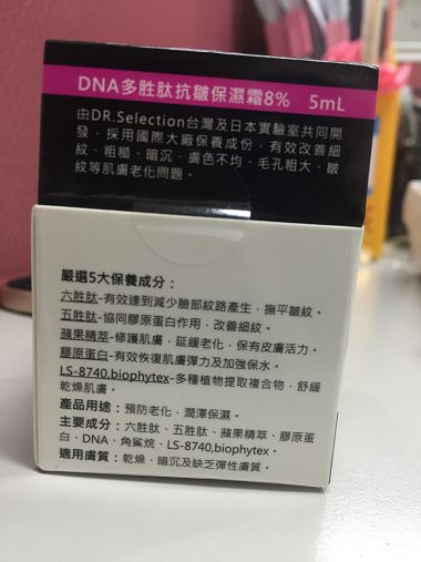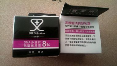 每個人都知道... 不過呢~ 剛開始聽到這名詞著實讓我疑惑了一下 以下是→DR.Selection賽萊斯DNA多胜肽抗皺保濕霜8% ←的介紹 高機能階段式抗老 有感保養 嚴選頂級五大成分 【產品特效】: 可以解決肌膚多種問題 不含礦物油 香精 香料 肌膚可以迅速吸收沒有負擔 【適用膚質】:乾燥、暗沉及缺乏彈性膚質 【使用方法】:每天早晚臉部清潔後,以附屬美容棒取適量(依個人需求)於掌心, 【建議搭配及步驟】: 【保存方法】:避免置於陽光直射處,並存放於陰涼處。 【注意事項】:避免產品入眼,使用時如有皮膚刺激出現,請停止使用並聯絡皮膚專科醫師。 【配送地點】:限台灣本島 【粧廣字號】:北市衛粧廣字第 10210181號 <本產品已投保兆豐產物產品責任險5000萬>