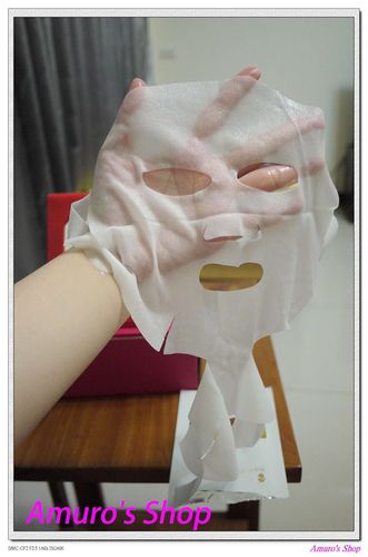 面膜上的精華液相當充足 在敷的時候可以感受到整個臉部及頸部都有均勻敷到 大約敷個15~20分鐘 就可以取下面膜 然後輕輕地用指腹按摩臉部及頸部使精華液吸收更徹底唷