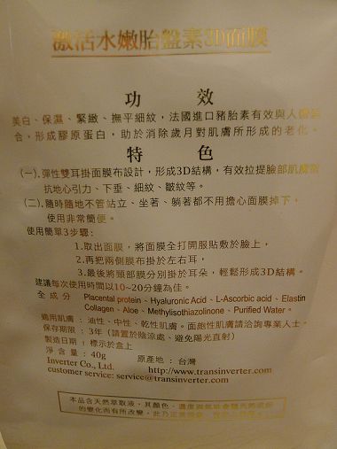 妳的肌膚總是缺水鬧乾旱嗎??這次的體驗除了能解除乾旱現象還能讓肌膚倍感滋潤,只要幾個動作就輕鬆搞定肌膚缺水問題。 謝謝【女人知己試用大隊】提供的–激活水嫩胎盤素3D面膜 這次的體驗是「激活水嫩胎盈素3D面膜」,話說電影都有3D超強畫質超立體影象呈現了,面膜當然也要有3D立體面膜才能讓肌膚完整吻合服貼才是,何謂3D面膜呢??就是在敷用時面膜自然呈現立體狀,無論從何角度看都是立體感,加上額外的3D雙拉提設計能讓肌膚激活出水嫩感。 雖然面膜包裝外有著BEAUTY RTANSFER的字樣,但是這是正港的台灣製造哦!!!!還是美容沙龍專用的面膜,哇!!!光看這些抬頭就覺得是頂級貴婦級的享受。胎盤素是許多輕熟美女的愛物因為除了能讓肌膚光滑水嫩外還有回春的效果,雖然我沒有吃過與用過胎盤素,但是看到胎盤素添加到面膜裡感覺就超讚的。