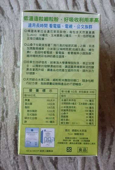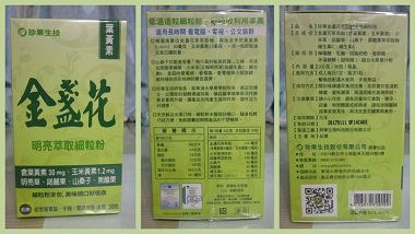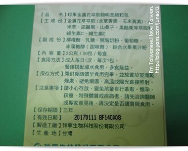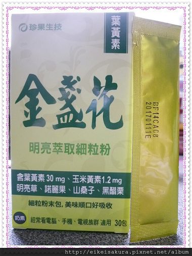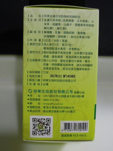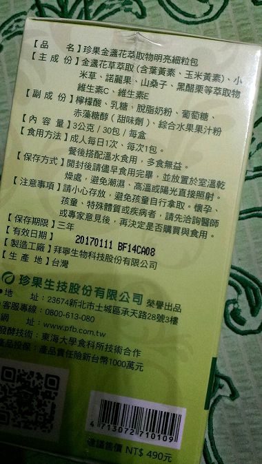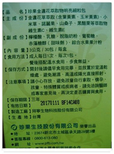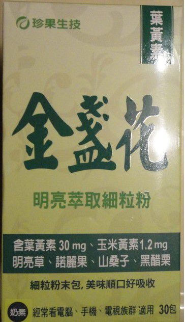 金盞花萃取物明亮細粒包,係由珍果生技公司出品, Made in Taiwan,一盒有30包, 屬於奶素,對素食者而言真是一大福音。