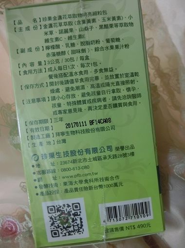 《珍果》金盞花萃取物明亮細粒包 產品主成分、副成分都清楚標示;每包3g,成人建議用量每日一包,餐後搭配溫水食用,多食無益。 來自台灣拜寧生物科技股份有限公司製造。 對我來說的另一大亮點是:珍果生技股份有限公司榮譽出品,發酵技術來自東海大學食科所技術合作。 更擁有新台幣1000萬元的產品責任險。 非常值得注目的是珍果生技研發長,正是前東海大學農學院院長:蔡正宗博士。 以其專業背景及獨家發酵濃縮技術,讓諾麗果精華與活性酵素含量再升級,產生協同作用。