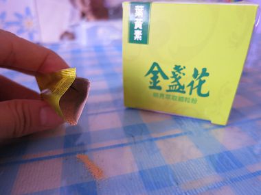 以往要攝取葉黃素,得接受包覆在膠囊體內, 大大一顆,彷彿吞藥般的痛苦, 想到就不敢領教喲 (^.<)〜 金盞花萃取物明亮細粒包1包有3g,倒出來是淡橙色粉體,
