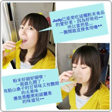 Judy已是常吃這種粉末食品的愛好者,因為粉末也很好吸收~~ 所以當然是一撕開就直接食用嚕:D