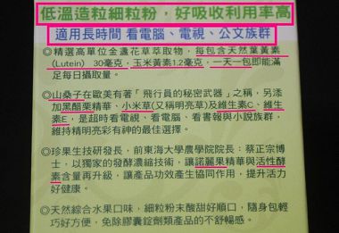 為低溫造粒細粒粉,對人體是很好吸收的,這盒是適合長時間使用雙眼的族群(對於現代人幾乎人人都是3C控吧!)