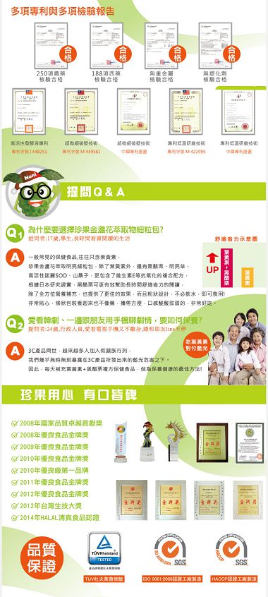 《珍果》金盞花萃取物明亮細粒包 也通過了各項檢驗及認證肯定, 讓消費者在購買及食用的同時, 都能更加放心與安心!