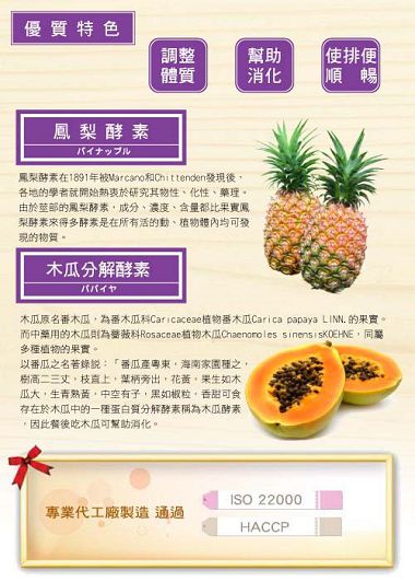 目前在歐美國家非常流行的保健食品,因其中鳳梨酵素是一種無毒性、無副作用的保健食品~ 它具有抗發炎、增加免疫力及溶解血栓之功效,所以在幫助我們的維持保健、增強免疫力方面扮演舉足輕重的角色喔(擷取自網路)~ 而木瓜酵素可分解蛋白質、醣類、及脂肪,所以像Judy是屬無肉不歡的一族,更是相當需要它,因它可幫助腸胃蠕動,且讓我的腸道乾淨輕鬆排便外,更可改善平衡失調的機能,抑制過剩、補充不足、改善體質。它有分解脂肪的作用亦可分解血管內的中性脂肪和膽固醇,其分解醣的作用能夠提高醣的代謝,它可重建血管、健康血液,使全身血液迴圈順暢,恢復青春(擷取自網路)。 (下圖引自網路)
