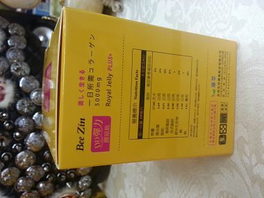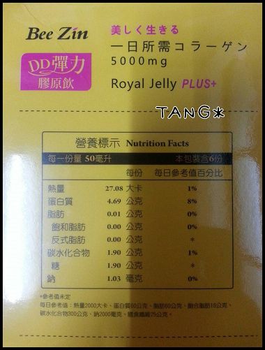 盒子上有營養標示 熱量不高 所以不用怕在保養的同時身材卻走樣了~ 成份 專利小分子膠原蛋白5000mg 日本專利蜂王乳150mg 青木瓜萃取 泰國白高顆 山藥萃取物
