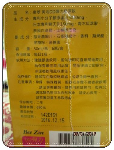 康萃美活DD彈力膠原飲 黃色外盒 給人一種清新活力的感覺 ◎專利小分子膠原蛋白5000mg 嚴選優質膠原蛋白經由酵素水解成小分子 100%膠原胜肽 極易吸收且不含脂肪 完全無腥味 絕佳口感 ◎日本專利水溶性蜂王乳 身體營養補給 必需胺基酸人體無法自行合成 維持青春美麗 葵烯酸 蜂王乳品質指標 維持能量 正常代謝 維他命B群 ◎泰國濃縮植物性白高顆 白高顆(野葛根) 具有大量的植物性雌激素 是維持女性正常生理機能的重要元素 ◎ 山藥萃取 山藥營養豐富 含蛋白質和纖維素 維生素A B1 C及鈣 磷 碘等礦物質 可提供人體多種必需的營養 另外更含有植物性雌激素 幫助養顏美容 ◎青木瓜萃取 青木瓜含又豐富的酵素 可以調節生理機能
