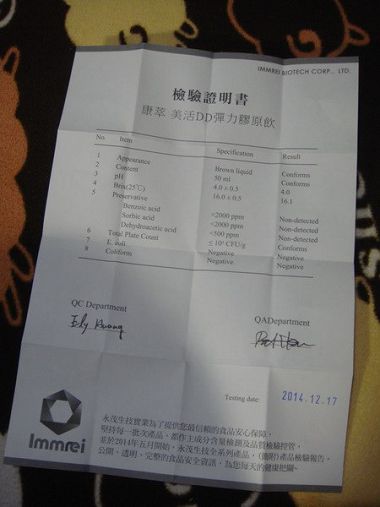 康萃美活DD彈力膠原飲的檢驗證明書 讓人安心又放心 蠻喜歡這樣替消費者著想的公司!!