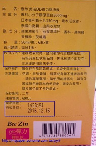 想到以前國中粉粉的媽媽也是常燉青木瓜排骨湯給我們喝 但我怎麼補好像也一樣耶!但我妹他們罩杯都比我大,讓我很羨慕 本以為注定一輩子都是小胸部囉XD 沒關係,希望康萃能救我,哈哈哈~ 食用建議:每日一瓶,小小一瓶彈力精華就有50mg,剛好補充一日所需的青春元素 裏頭就有專利小分子膠原蛋白5000mg以及日本專利蜂王乳150mg、青木瓜、泰國白高顆、山藥 看看熱量一點也不高才27.08大卡,可見保持青春美麗的同時也不容易長胖 一盒裡有6瓶裝,很好開盒拿DD彈力膠原飲 第一次看過裡面有產品會附上檢驗證明書,通常市面上的打印在包裝盒旁 尤其現在食安問題相當嚴重會讓人恐慌,還蠻貼心的能讓消費者更安心飲用 瓶裝上也有打印成分說明,就算盒子丟了也知道使用期限到什麼時候 飲用前別忘了記得搖一搖☺ (動畫圖片) 建議飯後飲用,像我自己已經習慣睡覺前喝,以自己方便為主 聞起來有淡淡的水果香,顏色靠近淡橘色 喝起來微酸酸甜甜的就像果汁一樣,好像有了戀愛般滋味♥♥♥ 這一瓶喝完後就讓我愛上了,害我瞬間還想再開一瓶 話說之前有吃過膠原蛋白粉結果超級甜的要死 跟你說唷~這完完全全不會,而且更沒有腥味 總以為UPUP是年輕女孩的專利,像我已經生完小孩當孩子的媽了 要改變也很難,只能默默任命!結果透過女人知己體驗Beezin,本來抱著試試看心態 這陣子喝完一盒皮膚有Q彈亮麗,就連胸部都有脹脹長大的感覺~簡直超開心der 話說我已經又跑去網購囤起來放,要開始由內而外大改變實施ㄉㄨㄞㄉㄨㄞ計畫 其實價格也不會說很貴,重點又是時尚美容教主艾莉絲真心推薦代言 一瓶能養顏又豐胸,這就是我想要的! 精美玻璃瓶裝,小小一瓶即使放在包包裡不易壓壞也不占空間 攜帶外出好方便,讓我們可以隨時飲隨時丟~ 這是康萃美活DD彈力膠原飲的介紹影片,希望大家會喜歡看不到請按此處