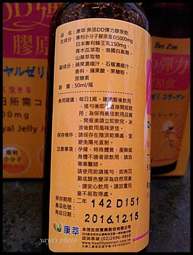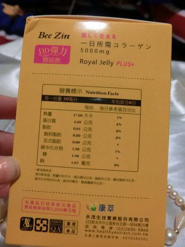 其實我覺得紅色配上粉紅真的很好看ㄟ~~尤其外出帶著時 真的吸引很多人的目光ㄟ~有種非常時尚的fu 來看瓶身及瓶口設計搂~ 金色的瓶蓋令產品有質感且對應包裝的黃 好看 深褐色的瓶身能夠減低陽光曝曬造成的變質 非常用心 瓶身也有跟外包裝一樣的產品介紹 還有一隻停~就是在說明有添加蜂王乳 F 成分有專利小分膠原蛋白5000mg這樣小小一瓶裡竟5000mg超讚的 還有日本專利水溶性蜂王乳150mg~蜂王乳除了可以有豐胸 養顏美容的效果外 研究結果證實,蜂王乳能夠有效殺死大腸桿菌、金黃色葡萄球菌、枯草桿菌、綠膿桿菌等病原菌。長期服用蜂王乳也能夠增強免疫系統功能,防止老化、使肌膚光澤有彈性,調節內分泌、舒緩更年期症狀,都是很明顯的成效。 青木瓜萃取 讓我們不用喝大碗大碗的青木瓜湯 就能輕鬆upup 白高顆 含高濃度異黃酮素,裡面所含異黃酮的含量遠高於大豆的含量(比大豆異黃酮濃度高5倍) 山藥萃取物 這個也是愛美女性必食用的啊!!! 還有添加蘋果汁 石榴汁 但是我想添加的不多吧 因為熱量圖上並沒有很高的熱量 每一罐的瓶身 也都有清楚標示 產品批號及有效日期 超讚的 公司資訊也都有喔 打開後可以看到 瓶口是圓弧的 不會讓你割傷嘴 文宣介紹無副作用 不添加人工色素 我覺得這就是我們要的阿~畢竟現在太多食安問題了 我們更需要注意這些 這裡也有寫到 山藥的營養豐富 含蛋白質纖維素 維生素 A B1 C 鈣 磷 碘等礦物質 更含有植物性雌激素 幫助養顏美容 白高顆經日 美 德 之科學家發現 具有大量的植物性雌激素 是維持女性正常生理機能的重要元素 青木瓜含有豐富的酵素 可以調節生理機能 日本專利低分子水解膠原蛋白 嚴選優質膠原蛋白經由酵素水解成小分子 100%膠原蛋白胜肽 極易吸收不含脂肪 完全無腥味 無添加色素 防腐劑 日本製程專利蜂王乳 特許取得第3810338號 身體營養補給 :必需胺基酸 人體無法自行合成 維持青春美麗:葵烯酸_蜂王乳品質指標 維持能量 正常代謝:維他命B群 調節生理機能_礦物質 蛋白質
