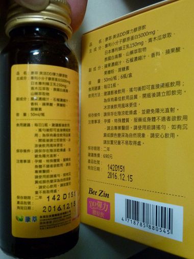 非常感謝 女人知己提供的 康萃美活DD彈力膠原飲 真的很高興可以獲得這次的體驗 因為自從生了兩胎後 停止為母乳時 我的胸部可以說是真的變得非常的平平平>< 從原本的c瞬間變成a 實在是洗澡都會偷偷哭 原本的內衣也都變成超空洞的 實在很 幸好有女人知己提供這個機會 讓我更一步認識康萃 也找回原有的自新與信心 首先我們來看外包裝吧 黃色的合身非常吸睛 我想是因為有蜂王乳的關係所以外包裝成設計成黃色的 外盒清楚的寫著DD彈力膠原飲 讓你一看就知道 除了補充膠原蛋白外 更大的特色是 幫你UP UP 而且還有知名藝人也是時尚教主的艾莉絲來推薦 讓我更有信心 因為他也是剛生完BABY 我想他應該也會在意胸部的變化 所以讓我更加期待這瓶美活DD彈力膠原飲的效果了 這次體驗的是一盒入6瓶裝的正貨 讓我可以連續六天飲用 來感受它的效果 外盒上有明顯的一日所需膠原蛋白5000MG Royal Jelly PLUS+ 上網查後才知道這就是蜂王乳的意思 重點是PLUS+讓你更知道他的效果是更上一級的!!! 專利小分子的膠原蛋白 大家都知道分子越小吸收度越好 所以如果一樣是膠原蛋白5000mg可是分子大小不同 吸收程度也不同 花一樣的錢你要選哪一種?再笨的都知道要小分子的膠原蛋白阿^^ 日本專利水溶性蜂王乳 市面上真的很少膠原蛋白飲有添加蜂王乳的 因為太不合成本了 大家都知道蜂王乳不便宜吧 可是康萃不只要添加 還幫你添加最好的 有日本專利的水溶性蜂王乳 第一在日本拿專利其實不容易 而且還是水溶性的 大雞知道水溶性的好在哪嗎?? 就是吸收比別人快 不會讓你喝了卻難以被吸收等於白喝 這點真的很讚賞!!! 濃縮植物性白高顆 如果跟我一樣有貧乳困擾的 或是期望自己胸再大一點的 都應該知道白高顆的功效或它的厲害吧 所以我也好期待喔~