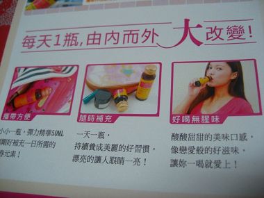 呵~一瓶就可以補充女人要的膠原蛋白,不但好喝又可以維持胸部UPUP~ 攜帶又便利^^大家趕快來試試看吧~~