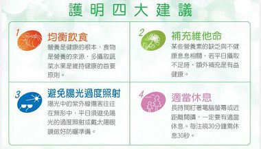護明的四大建議 1. 均衡飲食:多攝取蔬菜水果是維持健康的首要原則 2. 補充維他命:若平日攝取不足,額外補充是有益健康的 3. 避免陽光的過度照射:擦防曬或戴太陽眼鏡做好防曬準備 4. 適當休息:長時間盯著電腦螢幕或近距離閱讀,每注視30分鐘需休息30秒