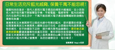 營養專家Maggie老師提到 葉黃素和玉米黃質素可以吸收光線中有害的藍光,提供重要的保護