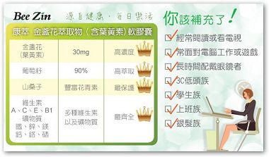 BeeZin康萃葉黃素軟膠囊又含有30mg高含量酯化型葉黃素,複方成分