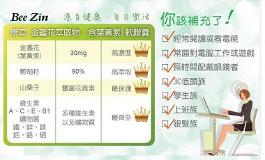 BeeZin康萃葉黃素軟膠囊,嚴選有美國專利的金盞花萃取,含葉黃素30mg,山桑子含豐富花青素,玉米黃質素可對抗藍光,且添加維生素A、C、E、B1,礦物質、鐵、鋅、鎂、鈣、鉻、硒等營養成份