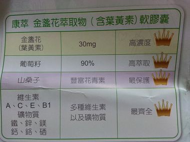 主要成分有:金盞花萃取物(含酯化型葉黃素及玉米葉黃素.葡萄籽萃取(含花青素).山桑子.維生素(B1.C.E.A).綜合礦物質(鐡.鋅.鎂.鈣.鉻.硒).番茄萃取物(含茄紅素).維生素B12