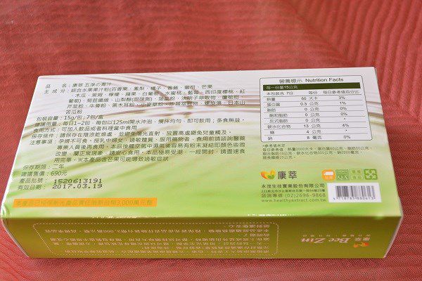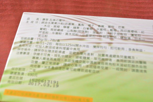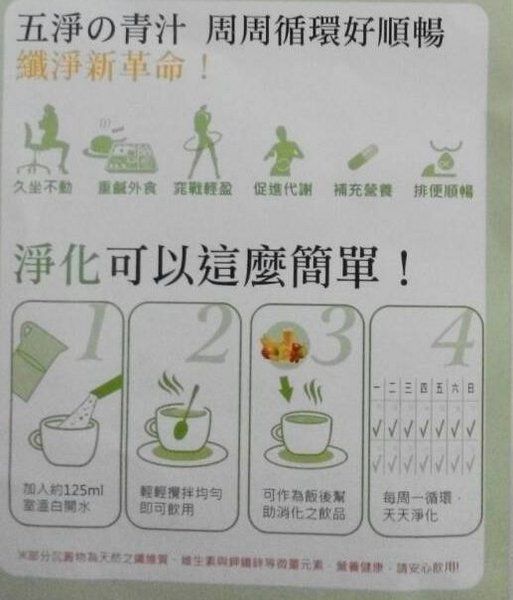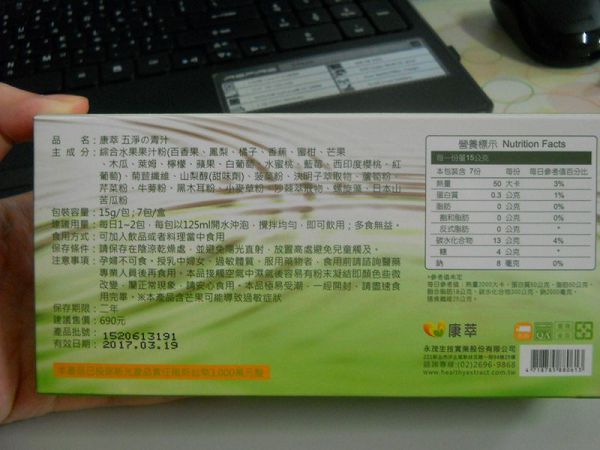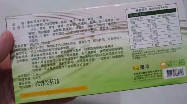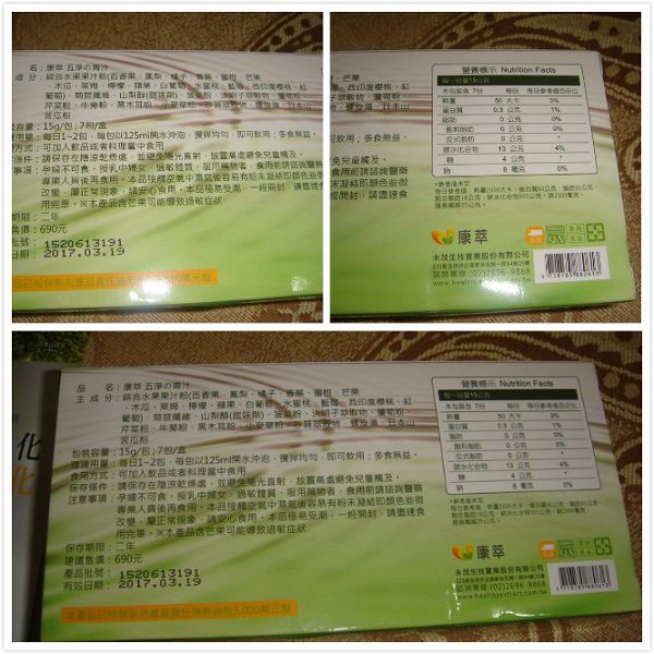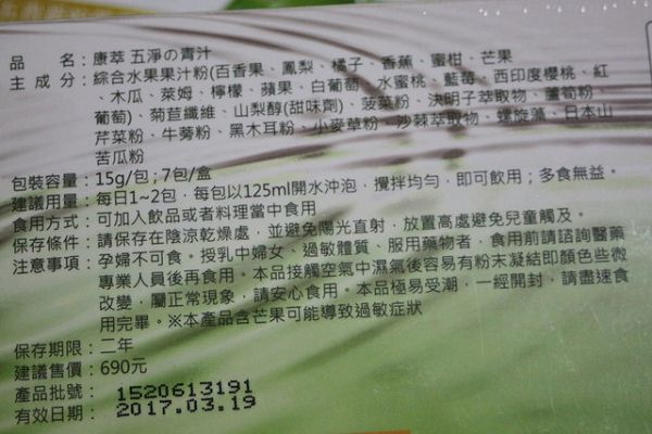 謝謝【女人知己試用大隊】提供的–康萃五淨の青汁 、木瓜、萊姆、檸檬、蘋果、白葡萄、水蜜桃、藍莓、西印度櫻桃、紅葡萄)、菊苣纖維、山梨醇(甜味劑)、菠菜粉、決明子萃取物、蘆筍粉、芹菜粉、牛蒡粉、黑木耳粉、小麥草粉、沙棘萃取物、螺旋藻、日本山苦瓜粉 包裝容量:15g/包 ; 7包/盒 建議用量:每日1~2包,每包以125ml開水沖泡,攪拌均勻,即可飲用;多食無益。 食用方式:可加入飲品或者料理當中食用 保存條件:請保存在陰涼乾燥處,並避免陽光直射,放置高處避免兒童觸及。 注意事項:孕婦不可食。授乳中婦女、過敏體質、服用藥物者,食用前請諮詢醫藥 專業人員後再食用。本品接觸空氣中濕氣後容易有粉末凝結即顏色些微改變,屬正常現象,請安心食用。本品極易受潮,一經開封,請盡速食用完畢。※本產品含芒果可能導致過敏症狀
