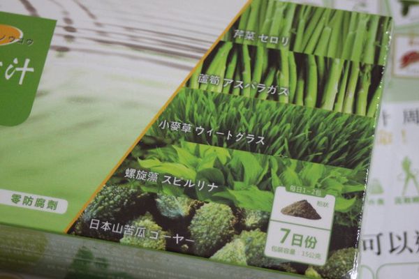 其中成分有:菊苣纖維、菠菜粉、決明子萃取物 、蘆筍粉、芹菜粉、牛蒡粉、黑木耳粉、日本小 麥草粉、沙棘萃取物、美國螺旋藻、日本沖繩山 苦瓜粉・・・等。