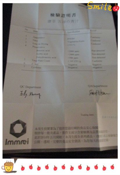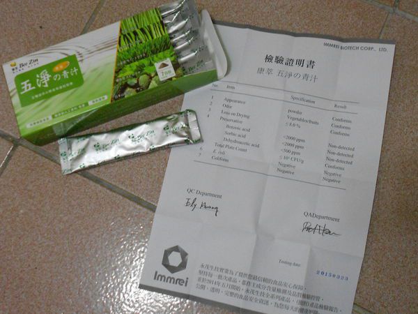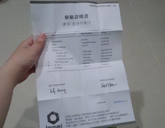 【女人知己試用大隊】BeeZin康萃五淨の青汁 各位別懷疑你的眼睛喔.確實[BeeZin康萃五淨の青汁]真的有附上檢驗證明.讓消費者吃得安心.因為現在的實安真的很令人擔心.但是[BeeZin康萃五淨の青汁]為了消除大家的疑慮所以還特別附上了這張.真的是太貼心了啦~