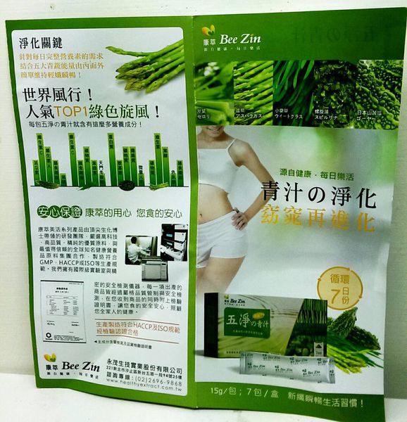 電視廣告說,老外老外三餐在外,是忙碌的現代 人的寫照,不僅三餐隨便吃,又高油、高鹽、高 熱量且營養不均衡、膳食纖維亦不夠,再加上在 辦公室久坐不動,很快就變成了「小腹婆」,俗 話說由瘦入胖易,由胖返瘦難,要如何使身體健 康又能窈窕,實在是很傷腦筋啊!還好謝謝【女 人知己試用大隊】提供的–BeeZin康萃五淨の青 汁的試飲,他無添加人工香料、色素,而且有五 種健康的蔬菜低溫萃取而成。