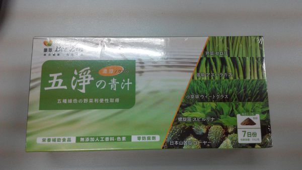 康萃五淨の青汁 商品介紹: 綜合水果果汁粉(百香果、鳳梨、橘子、香蕉、蜜柑、芒果、木瓜、萊姆、檸檬、蘋果、白葡萄、 水蜜桃、藍莓、西印度櫻桃、紅葡萄)、菊苣纖維、山梨醇(甜味劑)、菠菜粉、決明子萃取物、 蘆筍粉、芹菜粉、牛蒡粉、黑木耳粉、小麥草粉、沙棘萃取物、螺旋藻、日本山苦瓜粉。