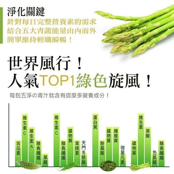 "康萃五淨青汁"裡有淨化關鍵的五大綠色能量: 芹菜:高纖維質,幫助消化 蘆筍:輕鬆增強體力 小麥草:排便順暢 螺旋藻:調節體質 日本山苦瓜:健康維持