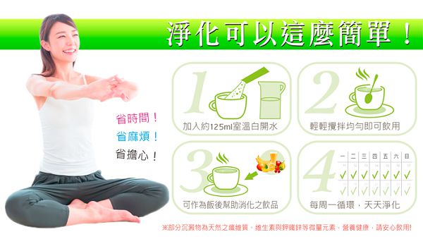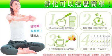 每日1~2包,多食無益 注意事項:孕婦不可食。授乳中婦女、過敏體質 、服用藥物者,食用前請諮詢醫藥專業人員後再 食用。本產品含有芒果可能導致過敏症狀。 全身淨化的感覺,也讓自己看起來更健康、美麗 ,且更有活力唷~