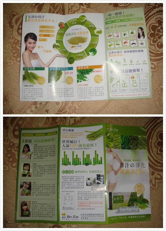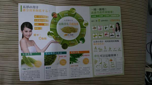 【女人知己試用大隊】BeeZin康萃五淨の青汁 為了要大家更清楚更快的認識[BeeZin康萃五淨の青汁].裡面還有這張更完整的解說單.沒說你可能不知道 裡面的成分含有沖繩山苦瓜、螺旋藻、日本小麥草等等的營養精華.讓你用喝的就能很完整的吸收了完整的蔬菜營養了喔.像我就是很不喜歡吃青菜的人.但是喝了[BeeZin康萃五淨の青汁]後真的好像有些改變了.每一小包裡就有5青蔬的營養.熱量卻只有[50]卡.怎麼不讓人心動呢~