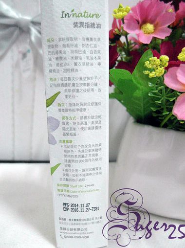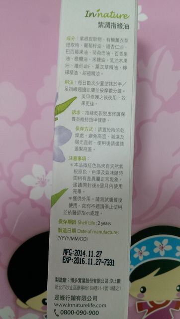 In'nature紫潤指緣油 ♠ 14種成分:紫根提取物、有機薰衣草提取物、葡萄籽油、甜杏仁油、巴西梅果油、荷荷巴油、