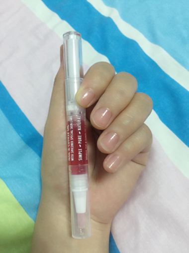 第一次使用指緣油 其實有點不知道該如何用XD 做成筆的小巧設計非常好攜帶耶! 隨便放進口袋就能隨地保養了~~~