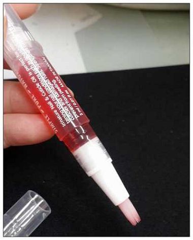 裏頭就是一隻像筆一樣的指緣油 顏色很紅潤 這個紅色可不是化學添加物哦 是天然的紫根萃取 所以才會有這麼漂亮的紅色