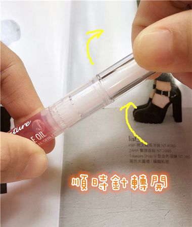 將指緣油轉開使用,第一次會轉較多次, 約莫至少六至八圈,會慢慢有油流出~
