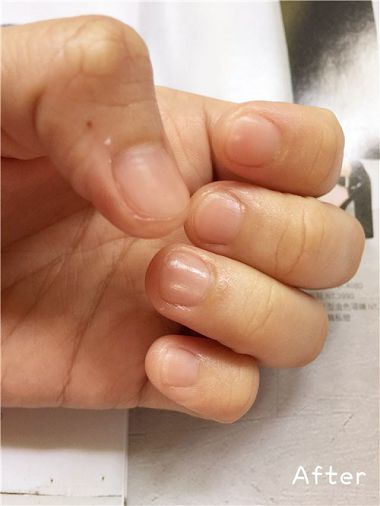 擦完後跟還沒擦之前有些不同 還沒擦時指甲都是一片慘白且毫無光澤 擦完後指甲有了些光澤也比較有氣色~ 每天數次保養 金覺得沐浴後保養更好唷~因為腳質軟化更好吸收