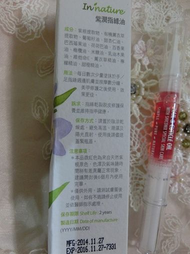 謝謝【女人知己試用大隊】提供的–In’nature 紫潤 指緣油 第一次使用時需要轉久一點 本文皆為本人親自試用過後的體驗心得(非商業性質)僅供參考。產品成分及功效說明,引用商品或官網(含粉絲團)所載,不等於宣稱具有療效,每個人使用習慣、體質膚質不同,實際效果依每人體驗為主。