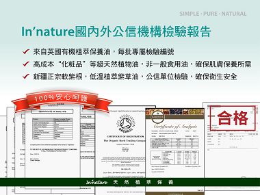 In'nature 在國內外都有檢驗合格報告,讓人安心使用,畢竟用在手上還是會不小心吃下肚阿