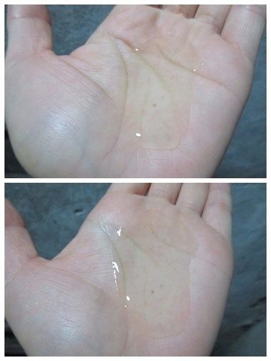 轉開瓶蓋 聞到清新的檸檬味以及草本香氛味 彷彿置身於大自然中 大約取出十元硬幣的量於手掌心上 透明濃稠的質地