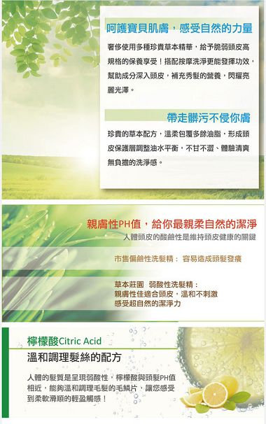 成分中有植萃精華複方調理, 親膚性PH值,溫和不刺激, 無添加矽靈、色素、螢光劑、Parabens。
