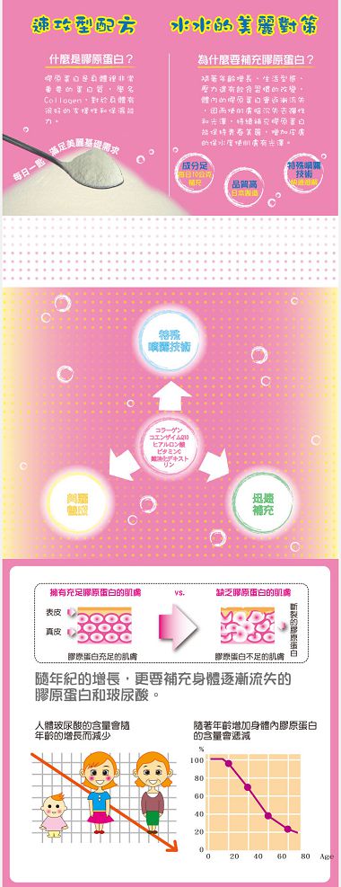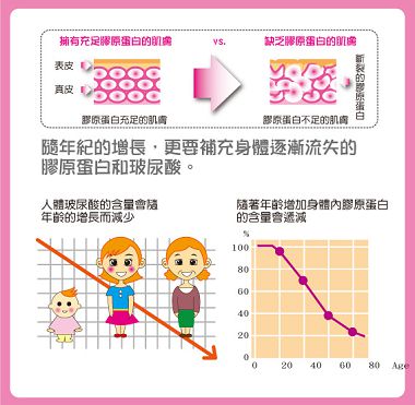 膠原蛋白是身體裡非常重要的蛋白質喔~~ 它對身體擁有很好的支撐性和保濕能力!! 可是阿~~隨著年紀漸長,膠原蛋白和玻尿酸也會逐漸流失 大家看看下圖就知道(下圖引自官網)