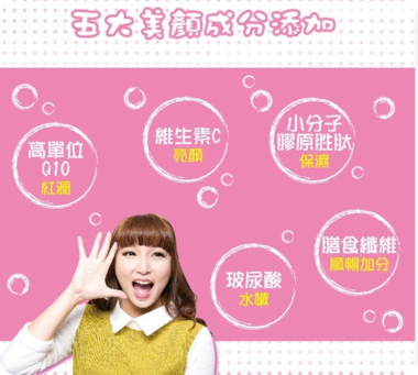 裡面還含有五大美顏成分添加:膠原蛋白(豬來源)、難消化湖精、抗壞血酸(維生素C)、雞軟骨萃取(含天然玻尿酸)、輔酵素Q10(上圖引自官網)。