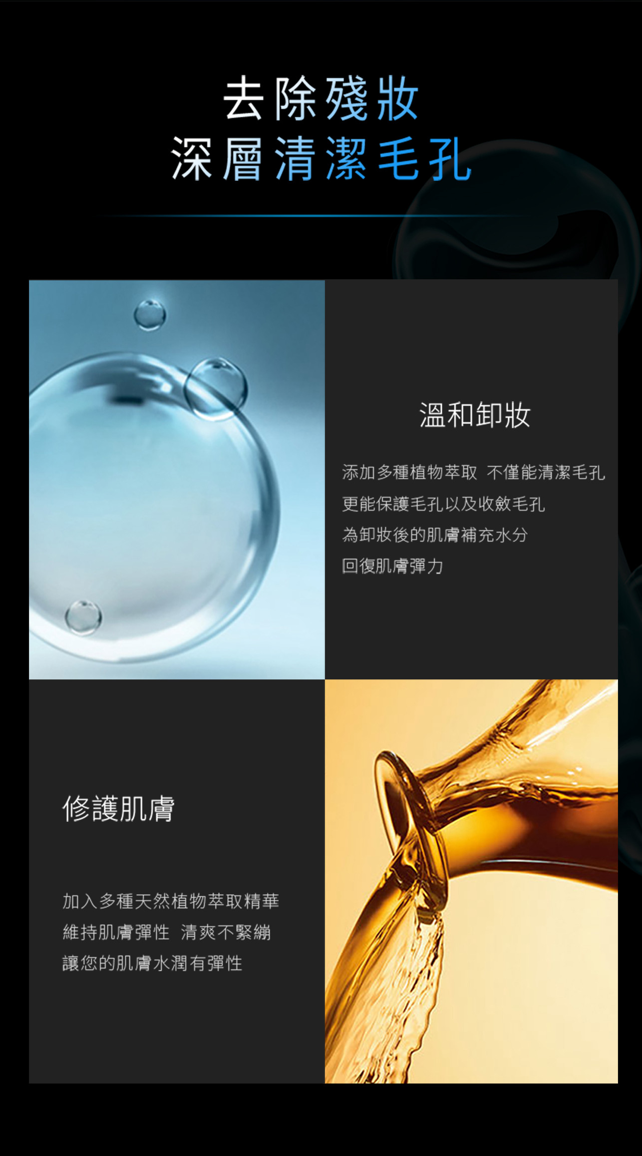 深入清潔毛孔,去除頑固殘妝 添加多種天然植物萃取 溫和卸妝,清潔、保養雙管齊下