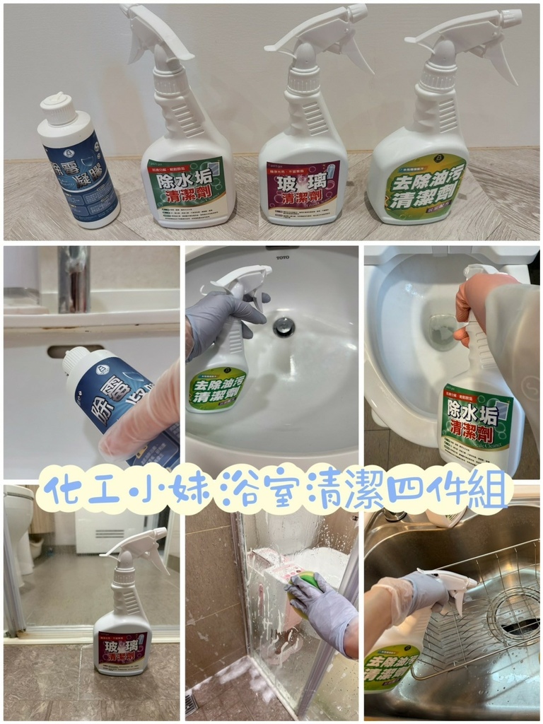 化工小妹 浴室清潔四件組 有除霉凝膠、去除油污清潔劑、除水垢清潔劑、玻璃萬用清潔劑 其中玻璃萬用清潔是我最少用到的 化工小妹 浴室清潔四件組-除霉凝膠 是我家浴廁必不可少的產品 因為浴室...