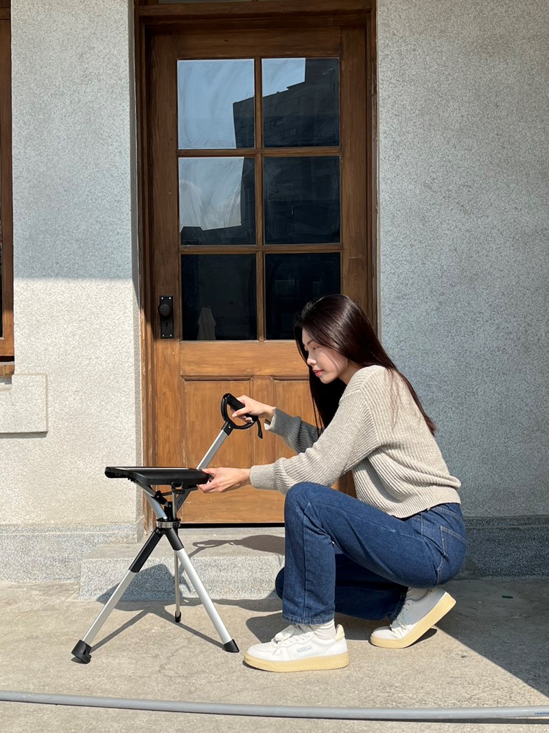 只要把側面的固定扣拉開,握把下方突起的地方往下壓,就可以一秒變成椅子啦!