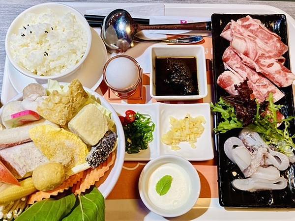 我選擇雪花牛+鮮蝦,陶板燒套餐均附什錦小火鍋+小菜+甜點和白飯。