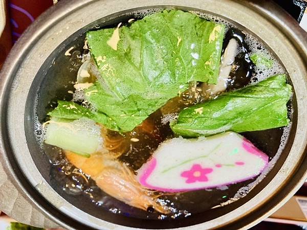 還有附上的什錦鍋,有蔬菜、蝦子、魚板、香菇等,湯底喝起來有柴魚的味道,挺好喝的!