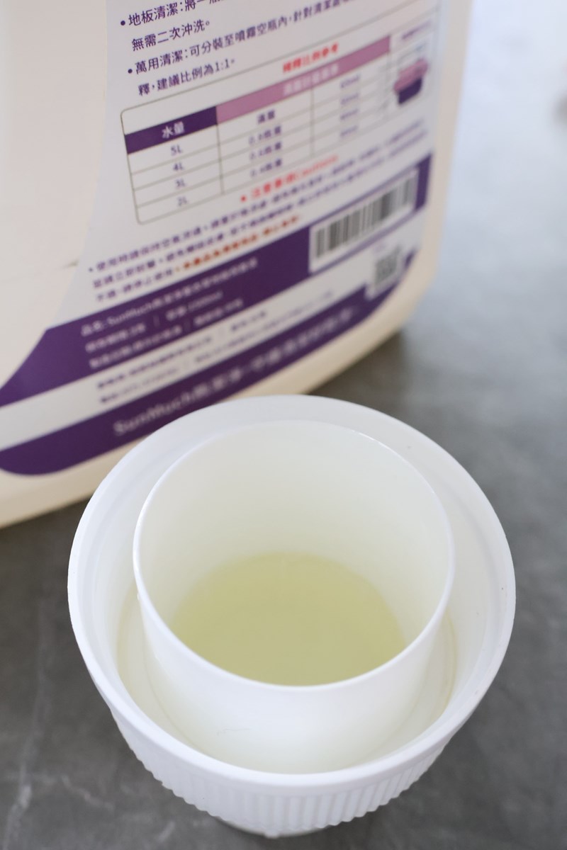 官網的建議是1:1的清潔劑跟水,如果是清潔地板的話就是1:100,