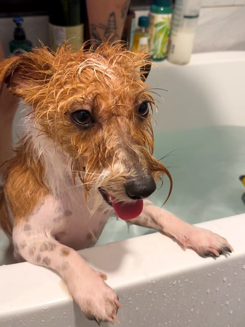 讓我們家比比洗澡也能洗的很舒服❤️你們看她都倒下了!